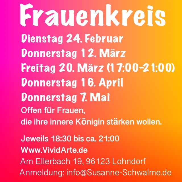 In einem Kreis von gleichgesinnten Frauen, genießen wir authentische Begegnung in einem sicheren und geborgenen Raum von Frauen unter sich. Wir treffen uns für erkenntnisreiche, erfüllende Abende und stärken unser Kraftfeld mit immer wieder frischen Übungen aus dem Repertoire von Gestaltpsychologie, Selbsterfahrung, mit Focus auf Lebendigkeit und echter Begegnung.